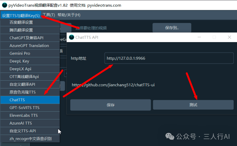 1.点击菜单-设置-ChatTTS,填写请求地址,默认应该填写http://127.0.0.1:99662.测试无问题后,在主界面中选择ChatTTS