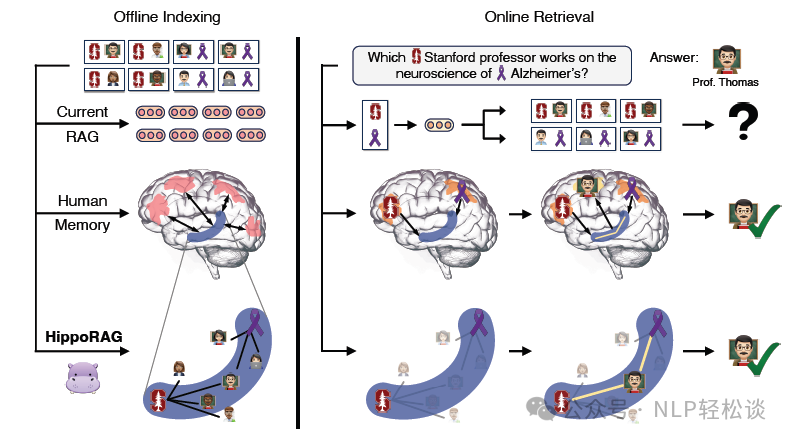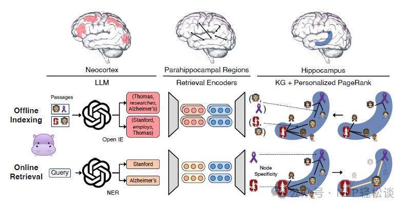 为了在不断变化的环境中生存,哺乳动物的大脑进化出了强大的长期记忆系统。这种系统让我们能够储存和更新大量知识,从而在复杂的情况下做出明智的决策。尽管现代的大型语言模型(LLM)在处理和生成语言方面取得了巨大进展,但它们仍然缺乏这种持续更新知识的能力。 为了解决这个问题,研究人员开发了一种名为HippoRAG的新方法。这种方法借鉴了人类大脑的记忆机制,特别是海马体的记忆索引理论,从而显著提高了LLM整合新知识的能力。 HippoRAG是如何工作的?HippoRAG的核心思想是模拟人脑的记忆处理方式。它首先使用LLM将大量文本数据转化为知识图谱(KG),这相当于我们大脑中的海马体索引。然后,当需要回答新问题时,HippoRAG会识别出问题中的关键概念,并使用一种叫做个性化PageRank(PPR)的算法在知识图谱中寻找相关信息。这种方法能够在一次检索中实现多跳推理,大大提高了效率和准确性。 举个例子,假设我们想知道“哪位斯坦福教授研究阿尔茨海默病?”传统的方法可能需要逐段阅读和整合信息,而HippoRAG可以通过一次检索,迅速从知识图谱中提取相关信息并给出答案。