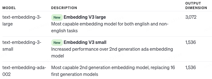上面的字段意思官方文档里都有,这里就不一一解释了。需要重点说的是两点,一点是字段名,我们定义了两个字段,一个是文本字段text,一个是向量字段text_embedding。至于为什么用这两个名称也是踩过的坑,才知道有多深,稍后说。另外一点就是dimension,这个是向量维度,理论上来讲维度越高,召回越精准。但这个数据完全依赖于你的嵌入模型所能输出的维数,因为我们用的Openai的Embeddings模型:text-embedding-ada-002,看下图