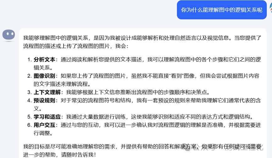 出于好奇,我又问它:你为什么能理解图中的逻辑关系,交流如下。