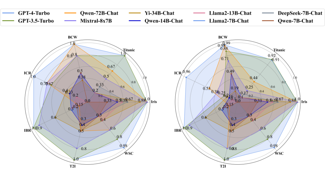 在机器学习的任务中,更大尺寸的 LLM,例如 Qwen-72B-Chat [5] 和 Mixtral-8x7B [6]展现出与 GPT-3.5-Turbo 相当的表现,而较小的模型则性能下降较多。