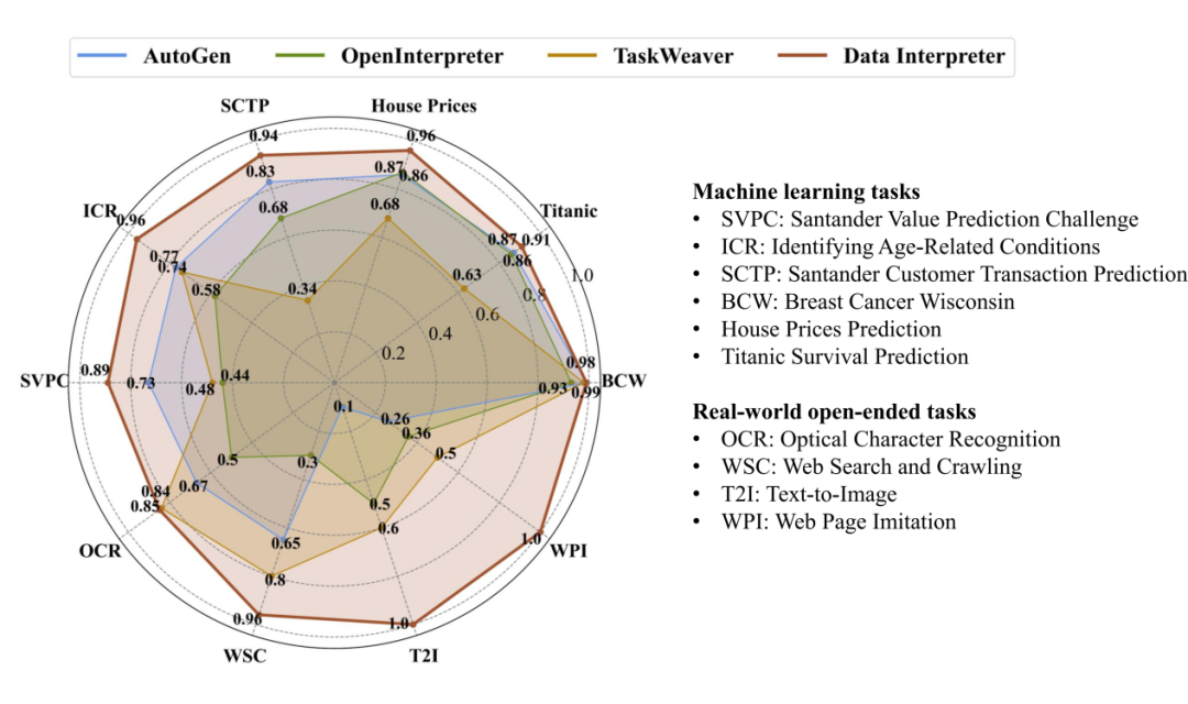 MetaGPT 团队联合北京工业大学、复旦大学、华东师范大学、河海大学、加拿大蒙特利尔大学、KAUST、圣母大学、厦门大学、香港中文大学(深圳)、香港大学、耶鲁大学、中国科学院深圳先进技术研究院、中国人民大学等多所顶尖高校和研究机构,共同推出了 Data Interpreter(https://arxiv.org/abs/2402.18679)。