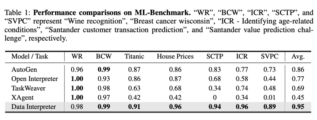在机器学习的世界里,精准和效率是衡量一个模型成功与否的关键。为了测试 Data Interpreter 在这一领域的能力,研究团队精心设计了 ML-Benchmark,这是一个集合了 Kaggle 网站上多种经典机器学习任务的测试集。