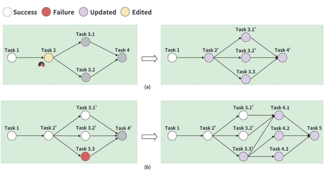▲ 数据解释器的动态计划管理:(a)通过人工编辑进行计划细化。左侧图像显示了在图上经过人工编辑的任务,右侧图像则展示了细化后的计划,包括更新后的任务 3.1'、3.2' 以及新增的任务 3.3。(b)对失败任务的计划进行细化。在任务执行后,如果任务 3.3 失败,细化后的计划将整合已有的成功任务,用更新后的任务 3.3' 替换原任务 3.3,并引入新任务 4.1、4.2、4.3 和 5。