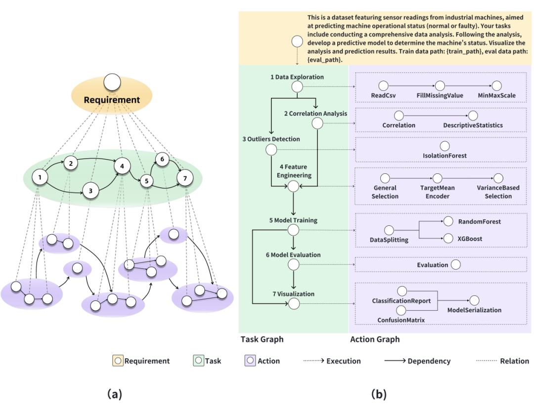 ▲ 分层结构:(a)一个有组织的任务和动作图,展示了高层级机器学习项目的工作流程,包括实现项目目标所需的任务依赖和动作序列。(b)任务的有向无环图(DAG),以机器操作状态预测问题为例。任务图展示了拆解的计划任务,而动作图(也称为执行图)则根据计划的任务图执行各个节点。每个节点的执行代码由 LLM 转换。