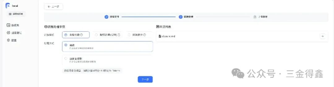 到这里,对于普通用户来讲已经基本满足日常生活中的大多数需求了。 但是对于一些团队、企业来说,这还远远不够!! 他们的数据是内部的,使用在线的 FastGPT 以及远程的 AI 模型会有数据泄漏的风险。这个时候我们可以选择使用本地部署的方式 + 本地 AI 大模型来实现一个完全私有化的 AI 智能应用。 docker-compose 快速部署手动创建一个目录,并下载配置文件(https://github.com/labring/FastGPT/blob/main/projects/app/data/config.json)和对应版本的 docker-compose.yml (https://github.com/labring/FastGPT/blob/main/files/docker)文件(注意,不同向量库版本的文件不一样)。 FastGPT 一共有三个版本:PgVector 版本、Milvus 版本和 Zilliz 版本。 三金这边机器配置不高,所以选择使用默认的 PgVector 版本,这个版本无需修改配置。 在docker-compose.yml同级目录下执行。请确保docker-compose版本最好在2.17以上,否则可能无法执行自动化命令。 docker-compose up -d