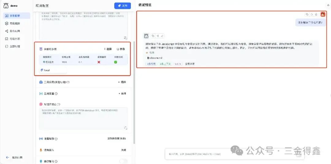 在创建应用的对话框中有四种类型的应用供我们选择,分别是: 简易模版:一个极其简单的 AI 应用,你可以绑定知识库或工具。 对话引导 + 变量:可以在对话开始发送一段提示,或者让用户填写一些内容,作为本次对话的变量 知识库 + 对话引导:每次提问时进行一次知识库搜索,将搜索结果注入 LLM 模型进行参考回答 问题分类 + 知识库:先对用户的问题进行分类,再根据不同类型问题,执行不同的操作