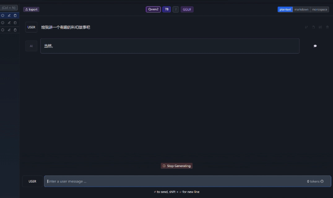 千问的推理速度大概是这样的,我录了个屏,可以感受下。CPU的占用率直接干到了100%。