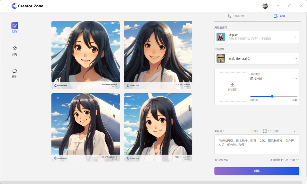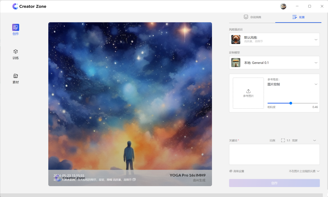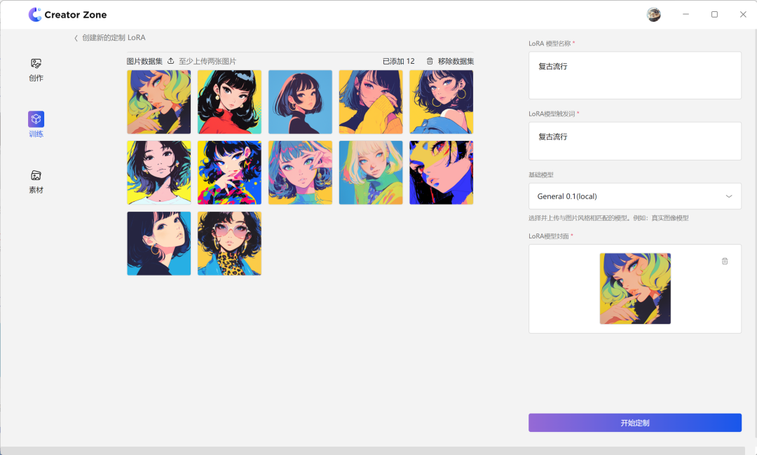 有一个很好玩的点是可以直接在这个产品上用十几张图本地就能训练一个LoRA模型。我就直接传了12张图上去,训了一个LoRA。