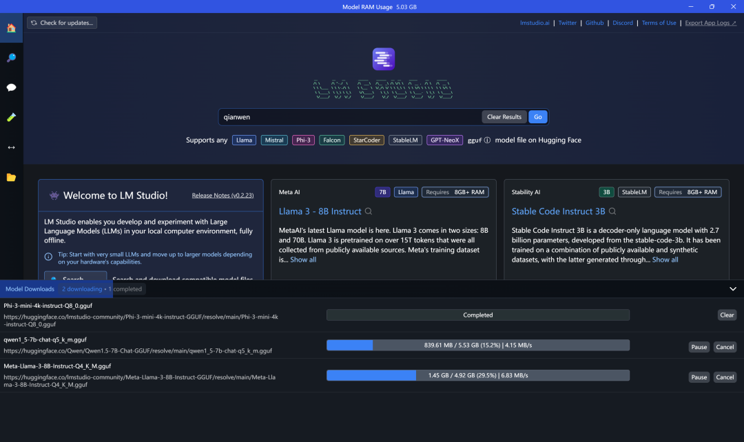 我直接装了2个最火的开源模型,千问1.5 7B、LlaMa3 8B。