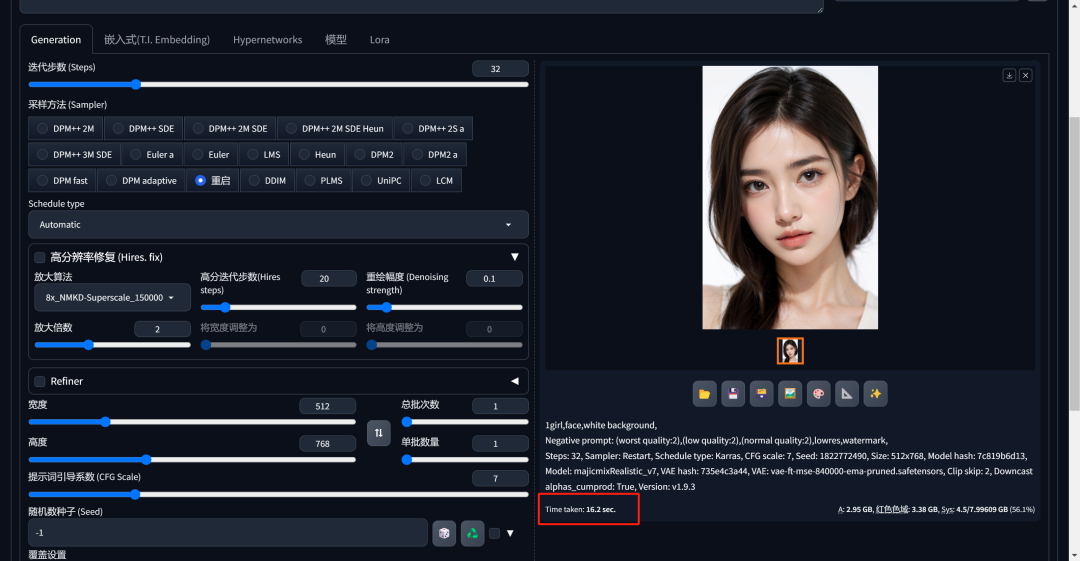 这个成本倒是挺低的,训练时间大概花了25分钟。 不过,对于一些专业玩家来说,我相信大家更关注的是SD在本地跑的时间。不过CPU的加强对SD基本没啥用,所以跑图基本还是会用独显来跑,这台笔记本是4060。 没有任何插件,经典的麦橘模型,一张512*768的图,花了15s。