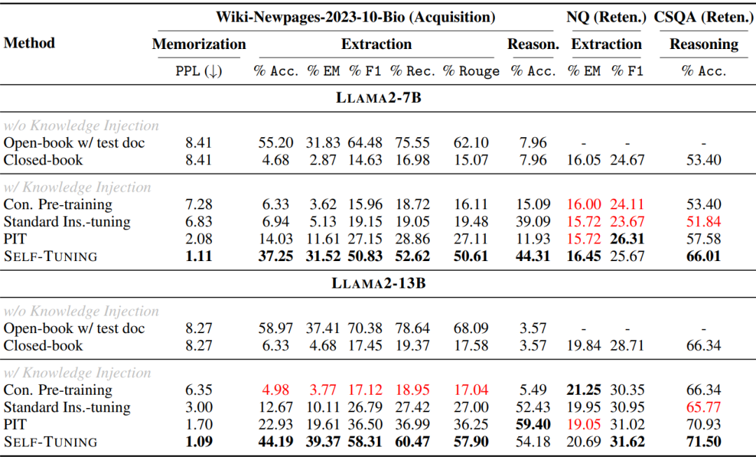 下表展示了SELF-TUNING框架在知识记忆、知识提取、推理方面的能力,可以发现该框架显著降低了困惑度(Perplexity, PPL),表明模型对新文档的记忆更为有效;