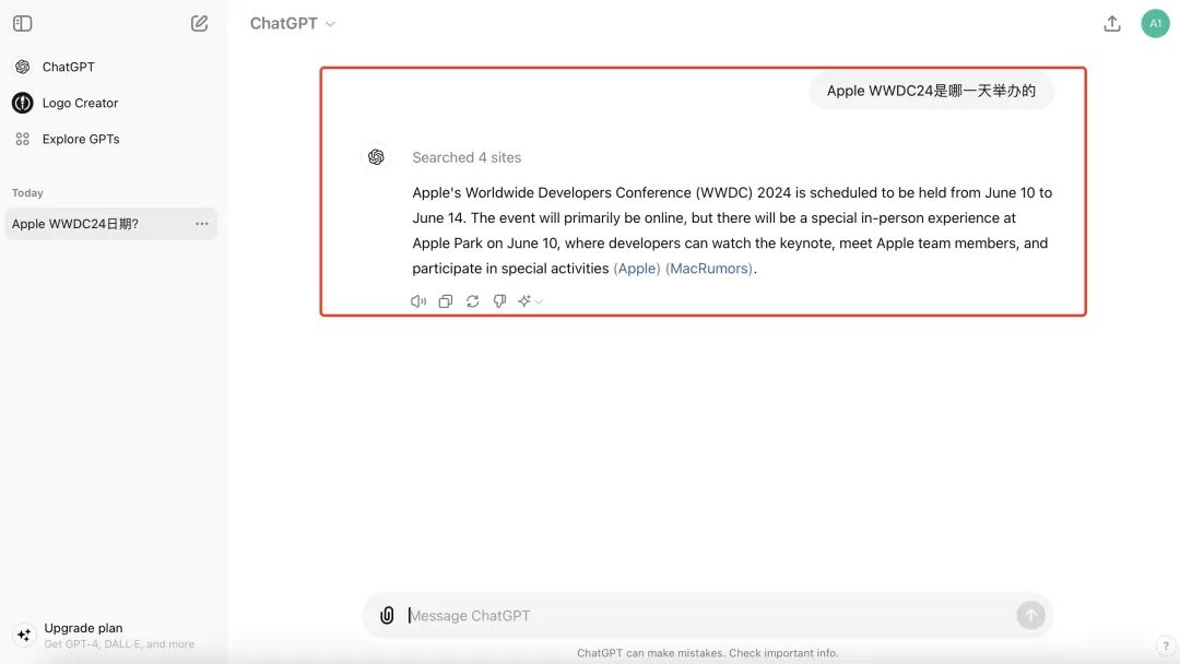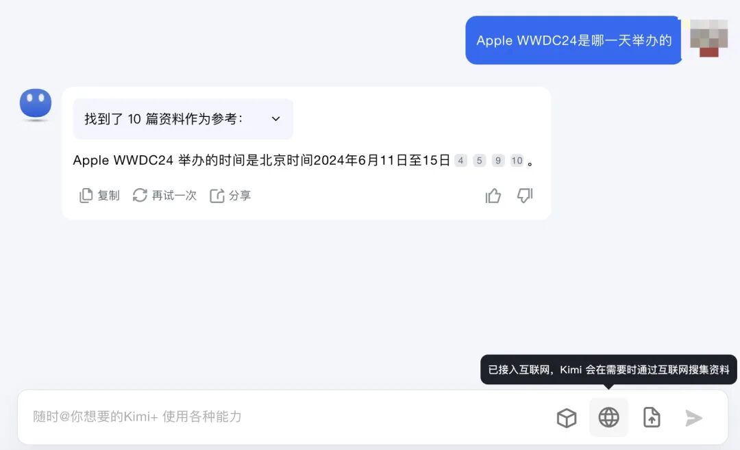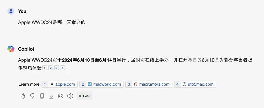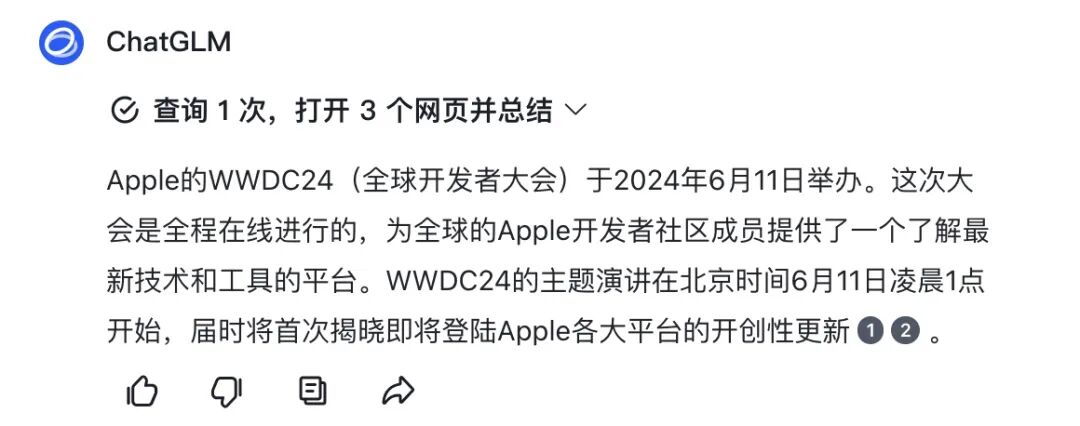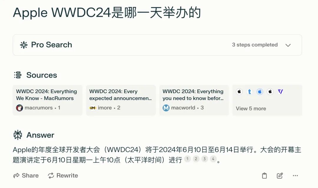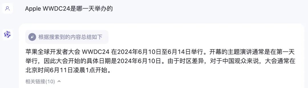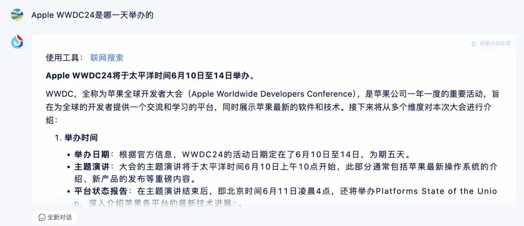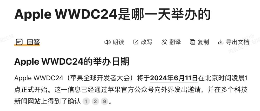 字节跳动推出的一款通用型的国内AI工具,基于字节自研的豆包大模型。豆包在国内AI领域也是占有一席之地的,有一定的用户基础。值得一提的是,豆包和前面介绍过的天工AI一样,无需注册登录即可直接使用,这波操作值得点赞。搜索结果准确无误,但似乎搜索源少了一些,同时在回答里,豆包还是使用了将来时的语态,其实WWDC24早已经开始了。