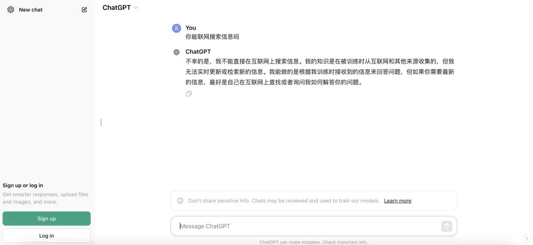 最新的ChatGPT,无需注册登录账号即可使用GPT-3.5,遗憾的是GPT-3.5并不能联网搜索。