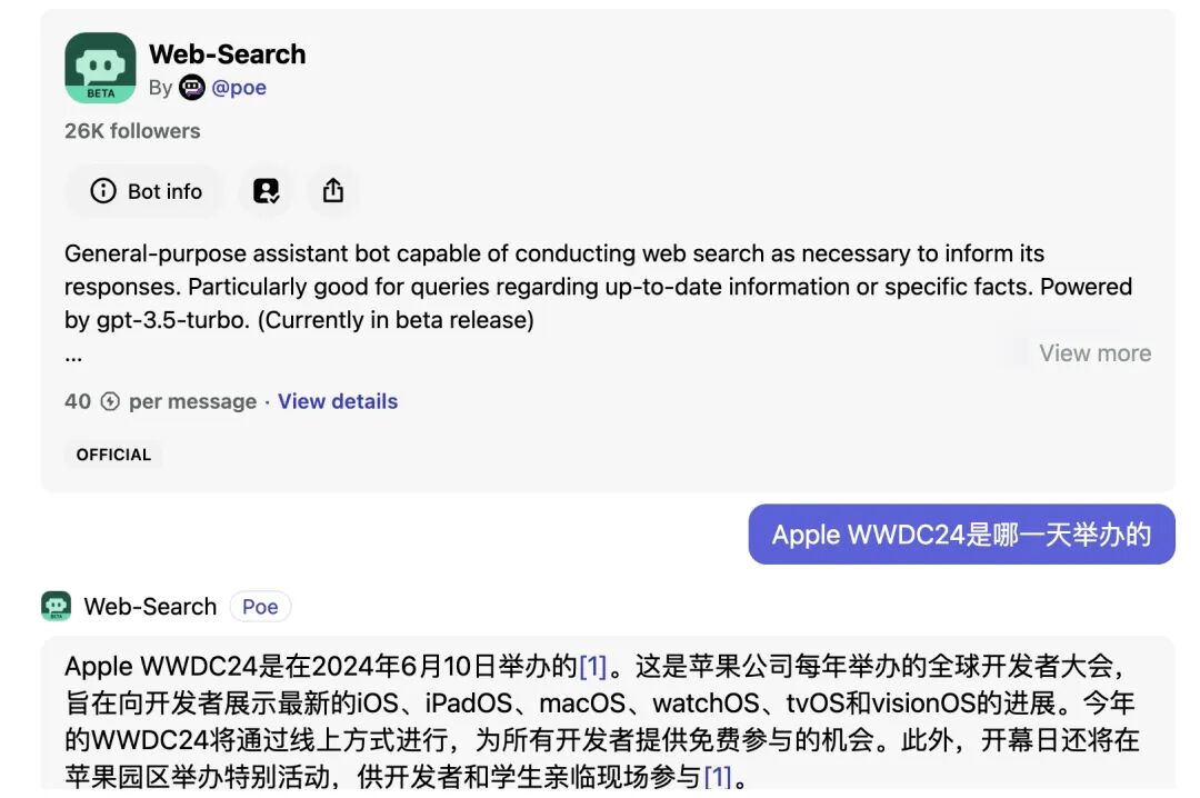由Quora(北美的“知乎”)推出的又一个能免费使用GPT-4o的AI平台,能够联网搜索也在情理之中。我个人使用下来,觉得Poe中,由Poe官方设置的Web-Search机器人的搜索效果最好。