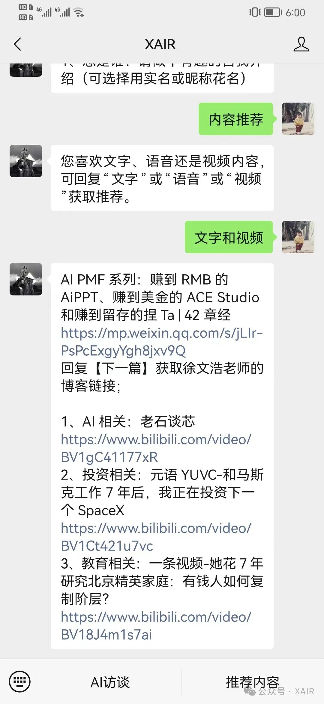 第二个场景是个人一直对内容推荐很感兴趣,在人挑内容的同时,内容是否也在挑人?每个人由于自己的认知以及社会角色和身份都有信息茧房(只看到自己圈层或阶层的信息),而现有的内容推荐算法如抖音等平台加剧了信息茧房,能否有更好的内容推荐机制也是值得探讨的(几年前做了个类似项目没做起来),所以希望这个bot还有内容推荐的能力。 针对以上场景,有复杂的实现方案也有简单的方案,简单的方案5分钟就搞定了,而复杂的方案需要考虑用户识别、记录存储入库可查看等问题。