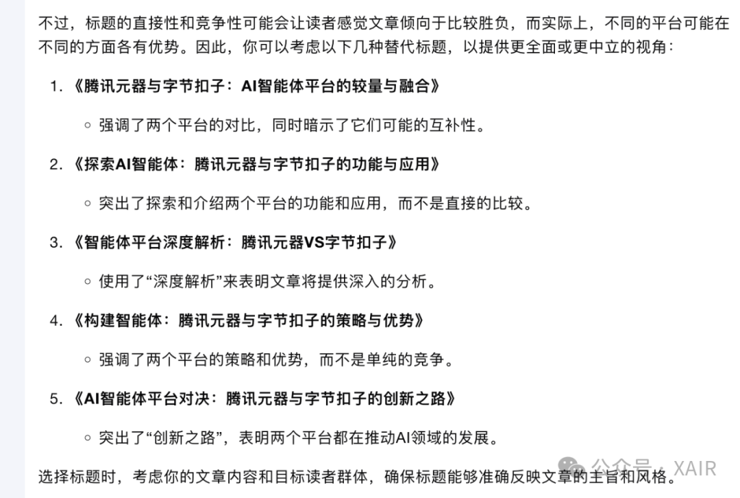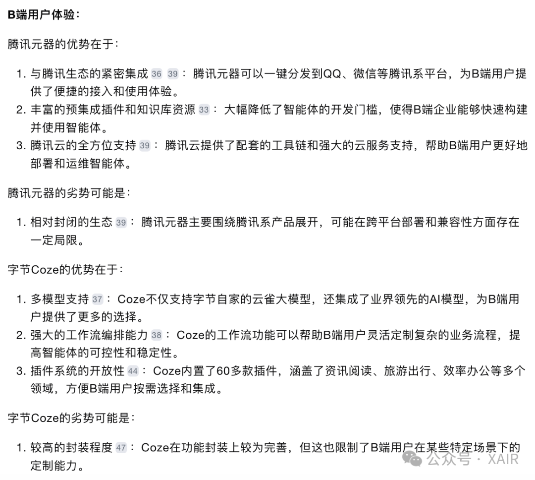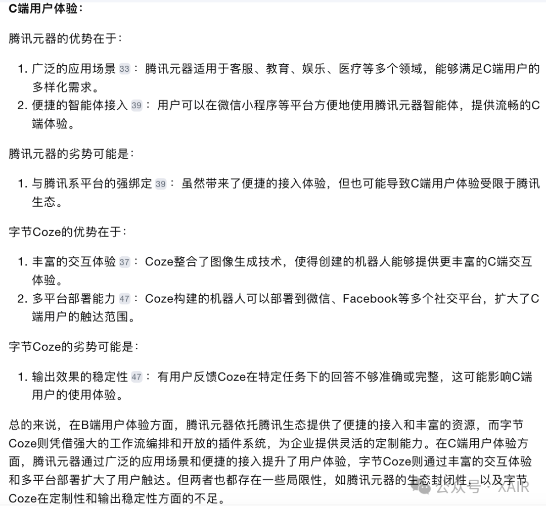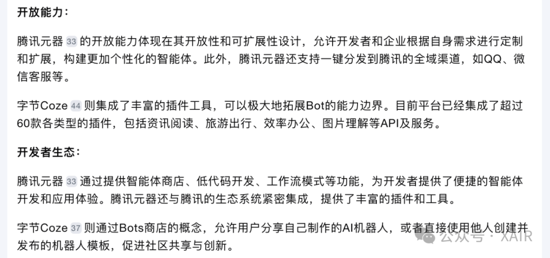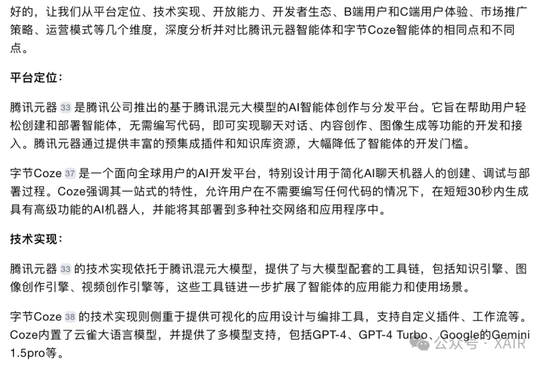 (配图:Kimi关于标题的建议,原标题为智能体之争——腾讯元器与字节扣子哪家强) 老规矩,先解释主题。 这个对比主题其实很不好写,因为智能体生态属于大厂战略布局,往大了写显得泛泛而谈没有干货,写小了显得没有深度。 本次只做简单科普与个人实操经历对比,并附上AI专业解读,一家之言,大家看个乐(叠甲结束)。 一、概念定义 1、什么是智能体? 随着ChatGPT与AI概念的爆火,出现了很多新名词,“智能体Agent”还有bot和GPTs等,Kimi(月之暗面的大模型)的书面解释是: 在人工智能和计算机科学领域,"agent"(智能体)和"bot"(机器人)这两个术语经常被用来描述自动化的软件程序,它们都可以执行某些任务或服务。尽管这两个词在日常使用中经常被交替使用,但它们在某些情况下可以有略微不同的含义和侧重点。 在实际应用中,这两个术语的界限可能非常模糊,很多情况下它们可以互换使用,特别是在描述具有一定智能和自动化能力的软件系统时。因此,是否使用"agent"或"bot"有时取决于个人偏好或特定社区的用语习惯。 简单理解就是AI机器人小助手,参照移动互联网的话,类似APP应用的概念(我记得GPT刚出的时候,还有人把GPT应用称为GAP),AI大模型是一个技术,而面向用户提供服务的是产品,所以有很多公司开始关注AI应用层的产品机会。我知道的在做Agent创业的公司就有好几家: