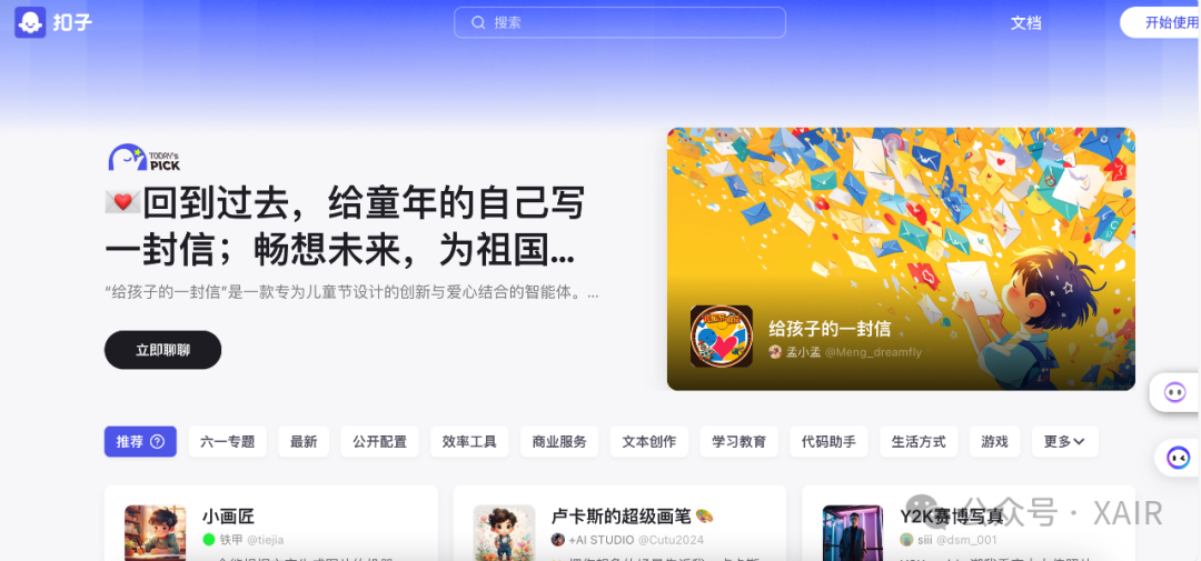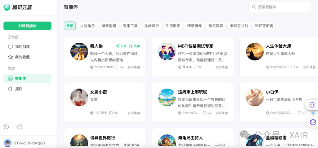C端案例:比如社交方向,用户注册之后先捏一个自己的Agent,然后让自己的Agent和其他人的Agent聊天,两个Agent聊到一起后再真人介入,也是一个很有趣的场景;还有借Onlyfans入局打造个性化聊天的创业公司。 B端案例:如果字节扣子和腾讯元器是面向普通人的低代码平台,类似APP时代的个人开发者,那还有一个机会就是帮助B端商家搭建Agent,类似APP时代专业做APP的。 国产GPTs商店来了。平替版GPTs商店,字节Coze扣子上线。2月1日,字节正式推出AI聊天机器人构建平台Coze的国内版“扣子”,主要用于开发下一代 AI 聊天机器人。 后来发现国内也有很多智能体开发平台,如Dify.AI,但个人比较常用的还是扣子,所以本篇主要对比字节扣子和腾讯元器。这个观点没找到出处,感觉很适合卖课宣传。个人理解AI智能体是给个人提效的,相当于你拥有了自己的数字员工,在WaytoAGI的分享上大聪明(赛博禅心作者)也表达过这个观点,Agent就是你可以不断PUA你的电脑,让它能不能做的更好呀,来实现你制定的目标(加粗显示)。