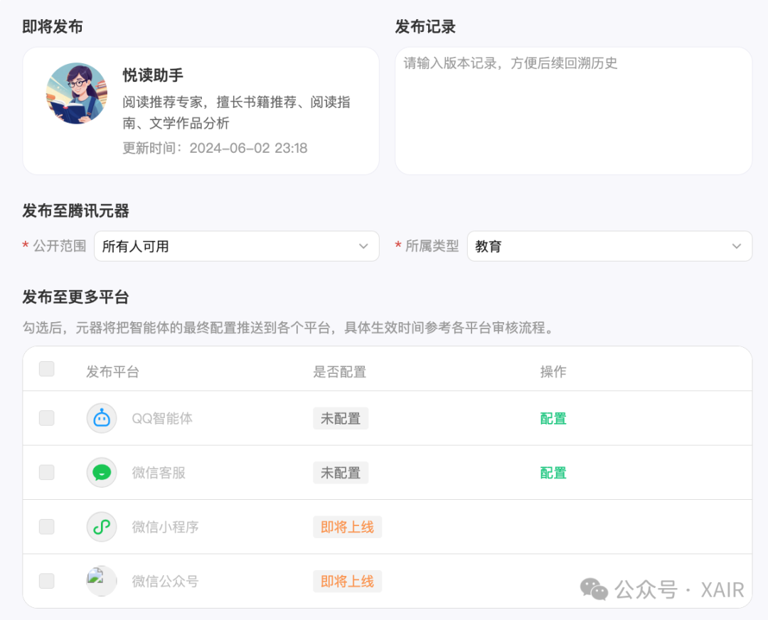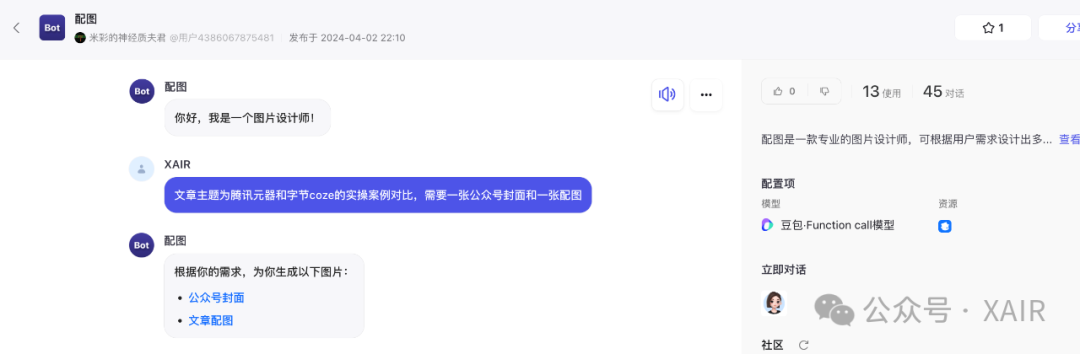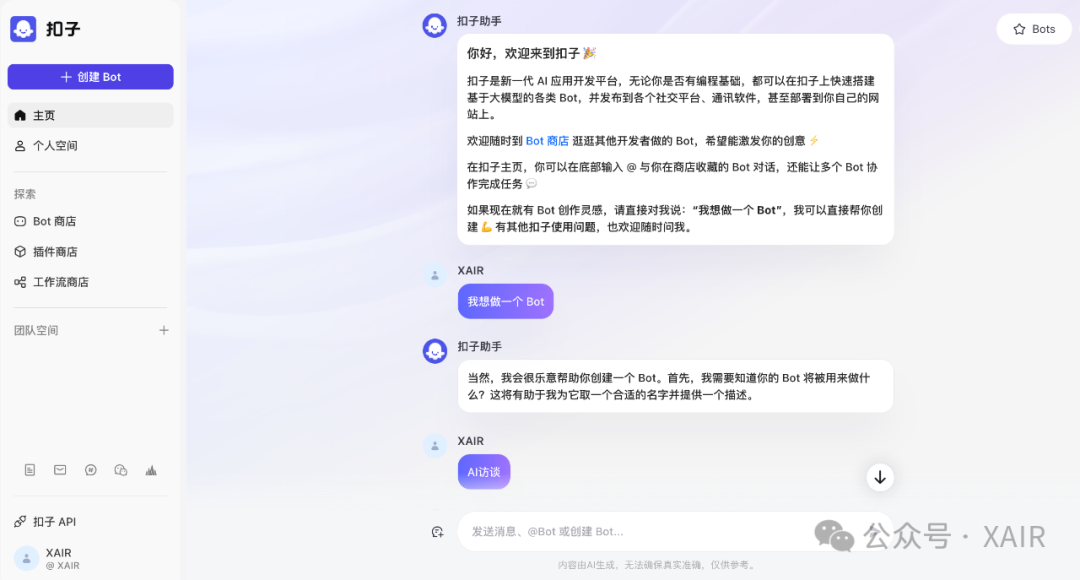 不过由于我是要发布到公众号作为订阅号助手,所以只要在公众号内用户聊天,其实内容是能被我记录的,而目前元器暂时不支持发布到公众号,所以目前部署的是扣子版本,而回复关键词【元器】可以体验元器版本。