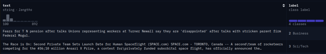 运行此命令将把 ag_news 数据集下载到 dataset 变量中。ag_news 数据集如下图所示: