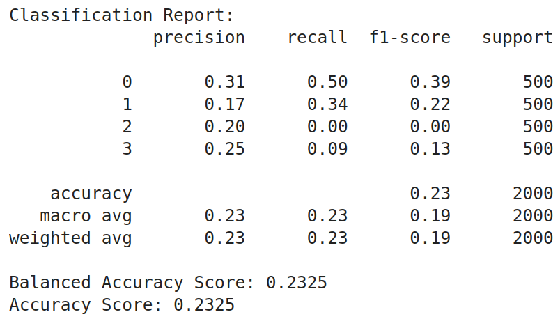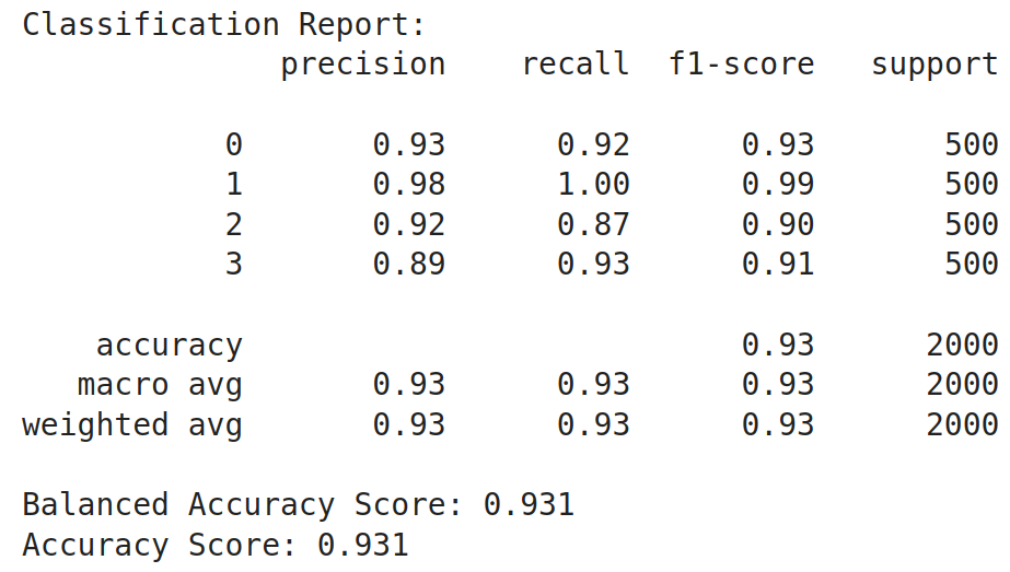运行此代码会产生以下结果。我们看到模型的准确率有了很大的提升。其他指标,如精度、召回率和 f1 分数也从初始值有所增加。总体准确率从训练前的 0.23 提高到训练后的 0.93,即训练后模型提高了 0.7,即 70%。由此,我们可以了解到,大型语言模型非常适合用作序列分类器