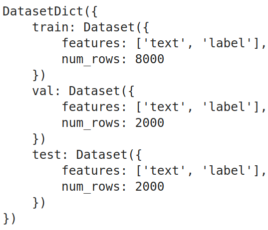 因此,我们可以检查训练数据框是否对四个标签都具有相同的示例。在将它们发送到训练之前,我们需要将这些 Pandas DataFrames 转换为 HuggingFace 训练库接受的 DatasetDict。为此,我们使用以下代码: