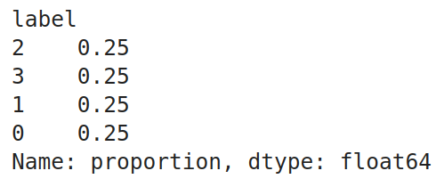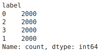 运行此代码会产生以下输出。我们可以检查所有 4 个标签是否具有相同的比例,这意味着每个类别在数据集中都有相同数量的示例。数据集很大,所以我们只需要其中的一部分。因此,我们使用以下代码从此数据框中抽取一些数据: