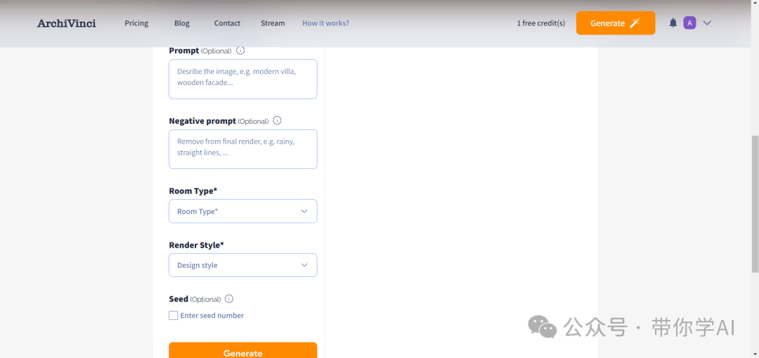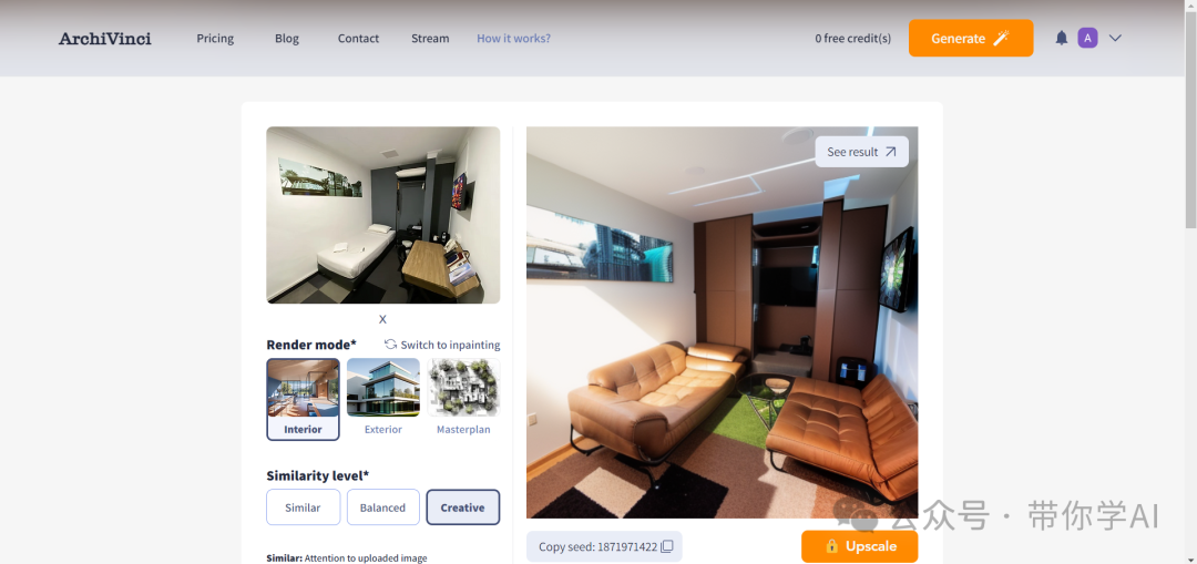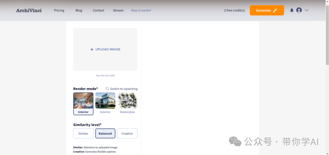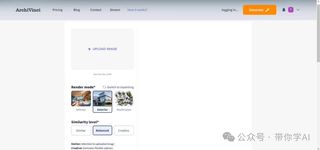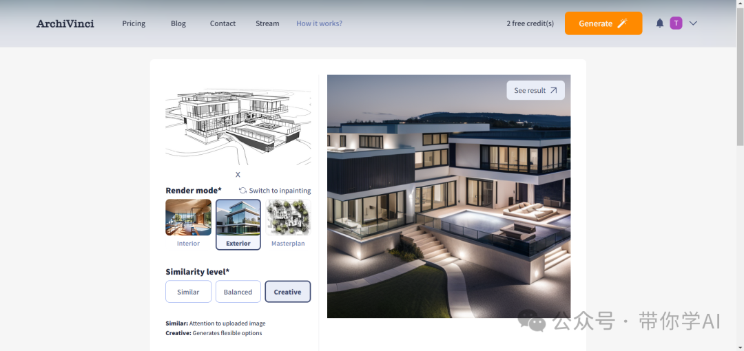 步骤3:单击生成并等待几分钟。ArchiVinci简直就是一个魔法师!你只需要画一下草图,它就能变出一个超赞的概念图来。效果简直炸裂,让你的设计变得轻松又有趣!