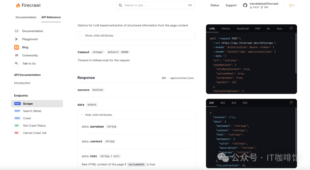 首先我们可以通过REST API的方式向firecrawl发送指令,我们首先可以使用 /scrape 这个API来抓取一下他们自己公司的网站,使用如以下curl命令: