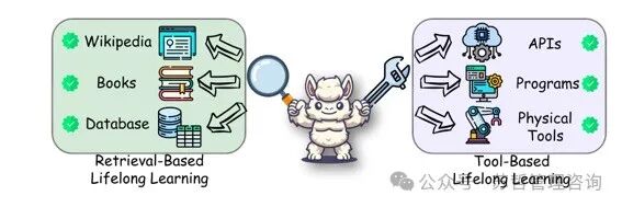 而不修改其参数。本调查将基于检索的终身学习和基于工具的终身学习视为两者是实现LLM终身学习的有前途的方法。图6中提供了示意图。