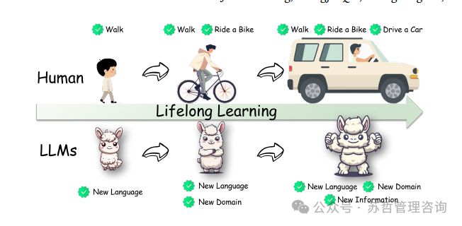 1.终身学习示例:人类可以逐步学习新技能,如走路、骑自行车和驾驶汽车。同样,终身学习的目标是使LLMs具备新的语言、领域知识和信息。