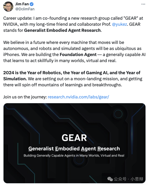 在谷歌和特斯拉之后,Nvidia也宣布加入智能机器人的行列。近日,Jim Fan宣布他将领导Nvidia的全新GEAR团队,专注于具身智能的开发。如果人工智能想要更直接地改变每个人的生活,它就必须跨入物理世界,这是一个我们都已经意识到的趋势。