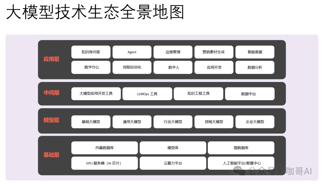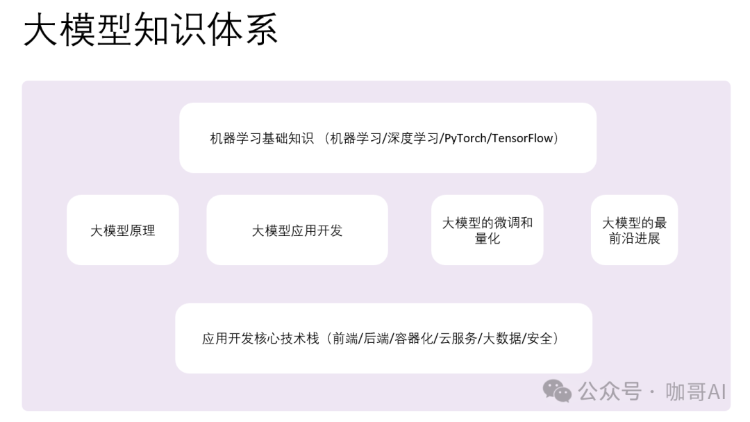 那么,这个分享中包括了哪十个问题,我又是如何回答的,今天就整理成文章的形式再次呈现给大家。(原视频可以在CSDN的视频号平台看回放) 问题1:大语言模型应用开发有哪些技术栈,他们之间的关系如何? 首先看一下大模型的整个知识体系。