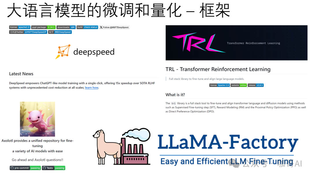 此时我们的确需要一些高级技巧,以及实战经验的总结和积累。有效地选择Embedding模型,优秀的向量数据库,优化的索引和检索方案,以及强大的生成模型都是必不可少的。 问题9:到底如何做大模型的微调、量化和推理加速? 对于这个问题,就更不是几句话可以说清楚的了。 微调:在特定任务上对预训练模型进行额外训练,以提高其在该任务上的性能。 量化:将模型参数从高精度表示(如32位浮点数)转换为低精度表示(如8位整数),以减少存储和计算资源。 推理加速:通过优化算法或硬件加速器减少模型在推理(即实际使用)过程中的计算时间,提高响应速度。
