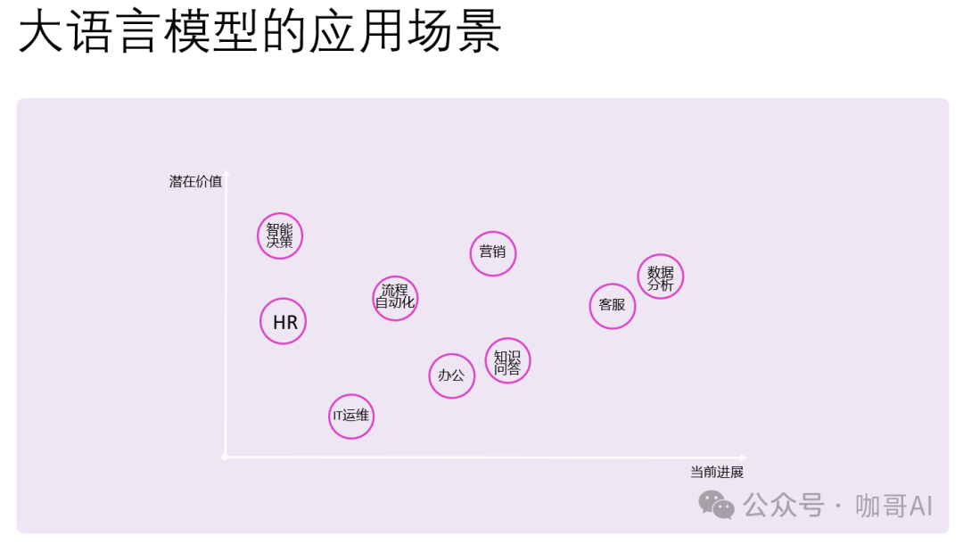 具体到大语言模型的应用场景,有两个维度,一个是当前进展,也就是落地的难度。难度小,进展就大。 有些场景是很难落地的,但是潜在价值却很大。比如如何让AI进行智能化的决策,也就是AI
