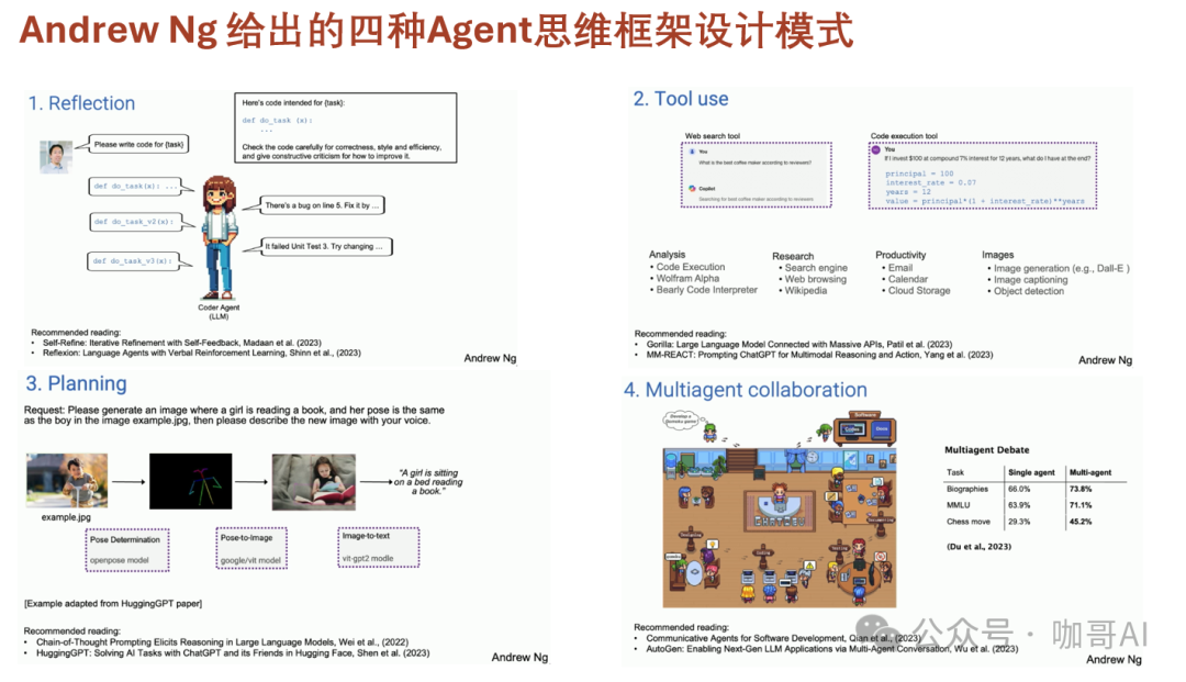 API则提供了一个非常直接和强大的选项。—— 对于我个人来说,现在我经常使用OpenAI API(或者其它任何国内LLM的API)直接创建LLM应用。问题6:Agent到底是什么,怎么开发,怎么用?有哪些认知模式? 我们把所有能够感知环境、做出决策并采取行动的实体或系统视为人工智能领域中的Agent。 Agent能够自主推理。