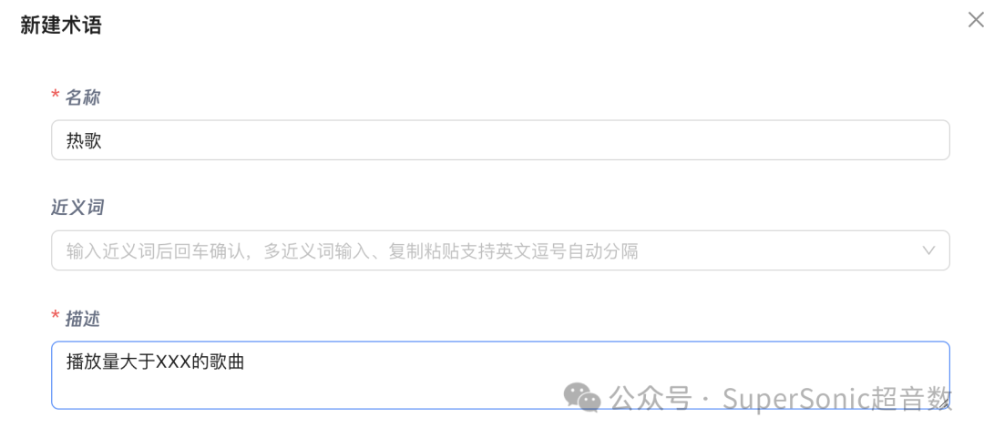 • 【语义建模】支持配置企业私域术语:过往SuperSonic主要依靠语义实体(指标、维度、维度值)来做文本映射,再通过RAG来增强大模型Text-to-SQL。但是,现实当中用户的问询中可能会包含特定的术语,并不一定直接指向某个语义实体。比如,在腾讯音乐内部场景中,“热歌”是常见的术语,意指“播放量达到一定量级的歌曲”。通过术语的配置与映射,可以将术语与语义实体间的关系描述,作为附加知识输入给大模型,有效增强SQL生成的准确性。
