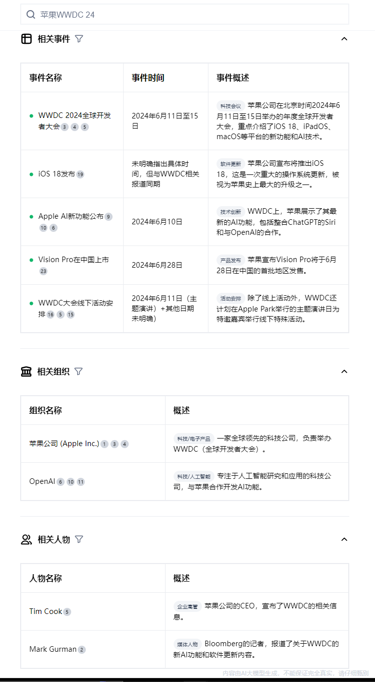 就比如刚刚发布的苹果WWDC 24,我们就可以让秘塔AI搜索为我们提供实时的咨询更新: