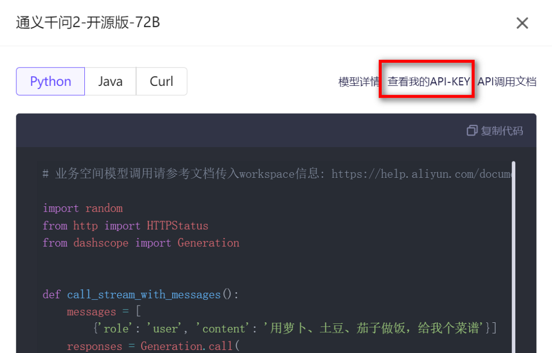 后面就算是自己长期用,价格也是完全不贵,毕竟1000 tokens只要0.5分钱,网速稳定,能力基本达到GPT4的中文水准,已经很好了。只需要先开通模型服务,点击一下即可;弹出窗口里面确认一下,我们要开通大模型推理、大模型部署、大模型训练等商品;然后进入模型广场,选择开源模型,我必须说,自从阿里云千问开源之后,我就像一个渣男一样,放弃了以前一直在用的开源模型,投入了千问的怀抱选择你想要的模型,然后点击API调用示例,然后选择查看我的API-KEY,如果以前没创建过,那就可以直接创建新的API-KEY,而且阿里百炼平台也提供了代码参考,这样就可以轻松开始使用千问2的API实现各种奇思妙想的创意了。