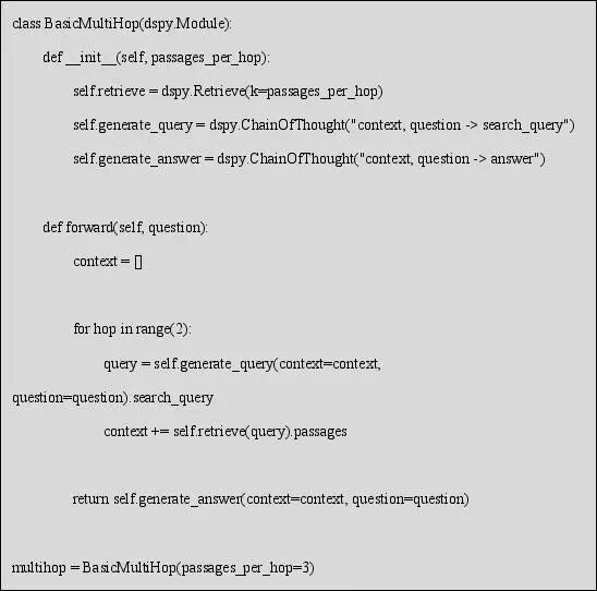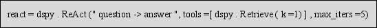 为此,本文首先测试了ReAct,这是一个用于工具使用的多步骤代理,它在DSPy中作为内置模块实现。在最简单的情况下,可以像下面这样在DSPy中声明特定签名的ReAct模块: