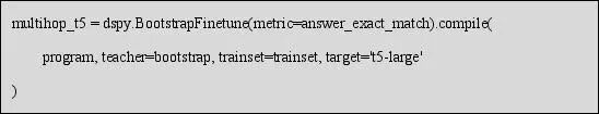 为了评估DSPy的微调能力,本文还评估了上述定义的编译器multihop t5,它产生了一个T5-Large(770M参数)模型。该程序在开发集上的得分为39.3%的答案EM和46.0%的段落准确率,仅使用了200个标记输入和800个未标记问题。对于编译,本文使用了一个由两个multihop和llama2-13b-chat组成的集成(联合)作为教师程序。考虑到其极小的尺寸和本地可用性,与像GPT-3.5这样的专有LM相比,使用T5-Large的编译程序将带来几个数量级的低成本推理。