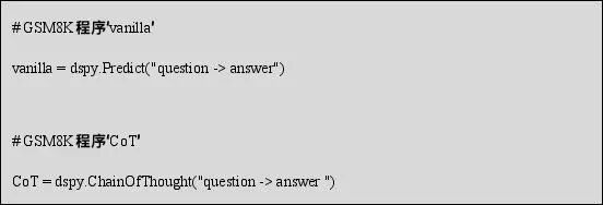 最简单的基线是上文中在GSM8K上使用的“question -> answer”签名的vanilla程序,它在适当编译时适用于此任务(以及许多其他任务)。