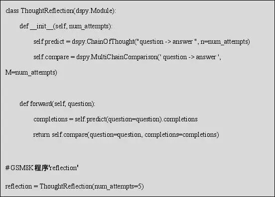 对于这项任务,本文考虑了三个简单的DSPy程序:一步式Predict模块(vanilla)、两步式ChainOfThought模块(CoT),以及最后是多阶段ComparerOfThoughts模块(ThoughtReflection)。这些程序完全由以下代码定义:
