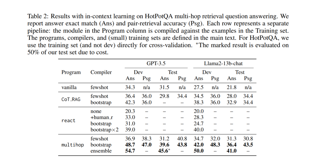 在这项研究中,本文探索了使用HotPotQA数据集的多跳问题回答任务,在开放域的“fullwiki”设置中。对于检索,使用了HotPotQA官方2017年“摘要”转储的搜索索引。搜索是通过ColBERTv2检索器进行的。HotPotQA的测试集是隐藏的,因此本文保留官方验证集用于本文的测试,并抽取了1000个例子用于此。本文在训练集(和验证集)中只保留了原始数据集中标记为“困难”的例子,这与官方验证集和测试集的指定相符。在训练和报告开发结果时,本文分别抽取了200个和300个例子。