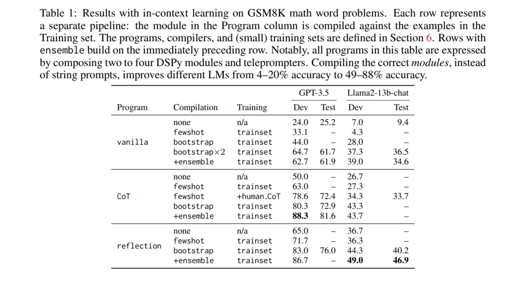 表1中总结了结果,包括开发集的结果以及在测试集上对每种方法有前景的代表的评估。首先,vanilla程序的结果显示,GPT-3.5和llama2-13b-chat在没有使用推理链的情况下,直接预测数学文字问题的答案存在困难。然而,通过使用bootstrap编译和迭代这个过程,可以显著提高性能。CoT程序在专家人类推理链的辅助下表现更好,但即使没有这些推理链,通过bootstrap也能匹配或超越这种性能。ThoughtReflection程序虽然代码更长,但表现最佳。通过组合DSPy模块和teleprompters,不同LMs的准确率从4-20%提高到49-88%。