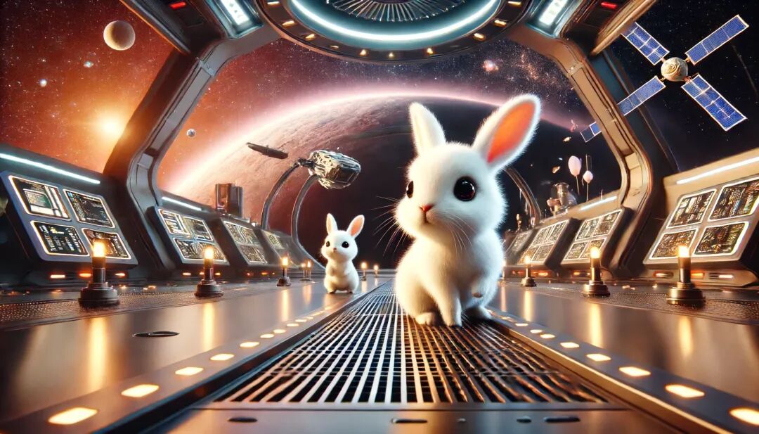 小白兔充满好奇地登上未来飞船,飞船内部充满了先进科技和迷人的光影效果。