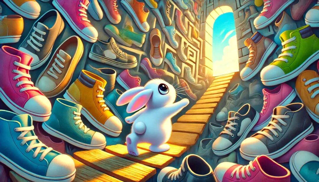 发现隐藏路线小白兔发现了一条由色彩缤纷的鞋子组成的隐藏路线,充满了探索的好奇和兴奋。