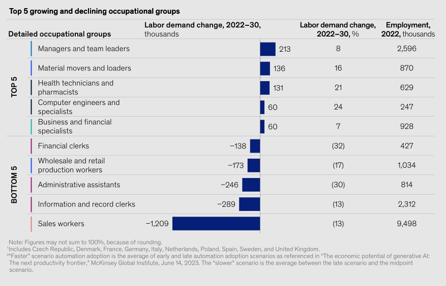 报告指出,2030年,批发与零售行业将会成为欧洲就业市场变化最大的行业,这是因为人工智能的引入带来的就业需求变动。