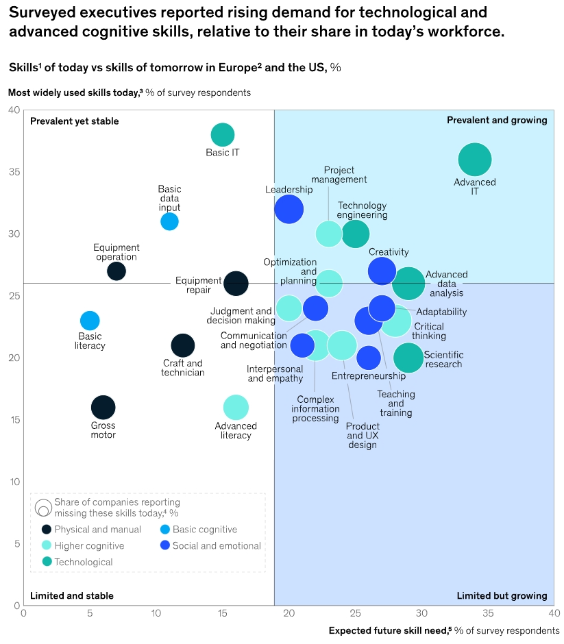 麦肯锡报告指出,2030年技术技能增长20%。这一变化的背后是科技的发展,在未来各行各业都离不开技术提升。