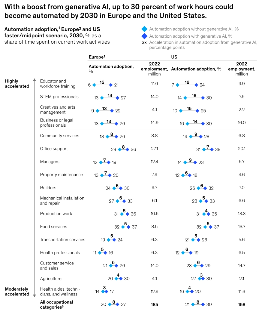 到2030年,欧洲和美国高达30%的工作时间可能会实现自动化。AI的发展将会进一步取代重复性和低技能工作,带来极大的生产力提升。